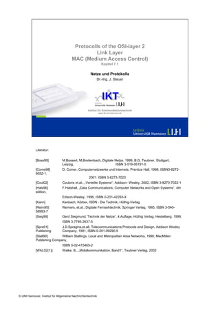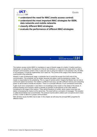 The document discusses media access control (MAC) strategies for shared transmission media. It begins by explaining the need for MAC in cases where multiple users share a common channel. It then discusses different MAC approaches such as scheduling versus random access, centralized versus distributed control, and examples including TDMA, slotted ALOHA, and CSMA/CD. Key MAC influences like distance between stations, throughput requirements, traffic patterns are also covered. Specific MAC protocols discussed include those used in ISDN, Ethernet, GSM, and wireless networks.