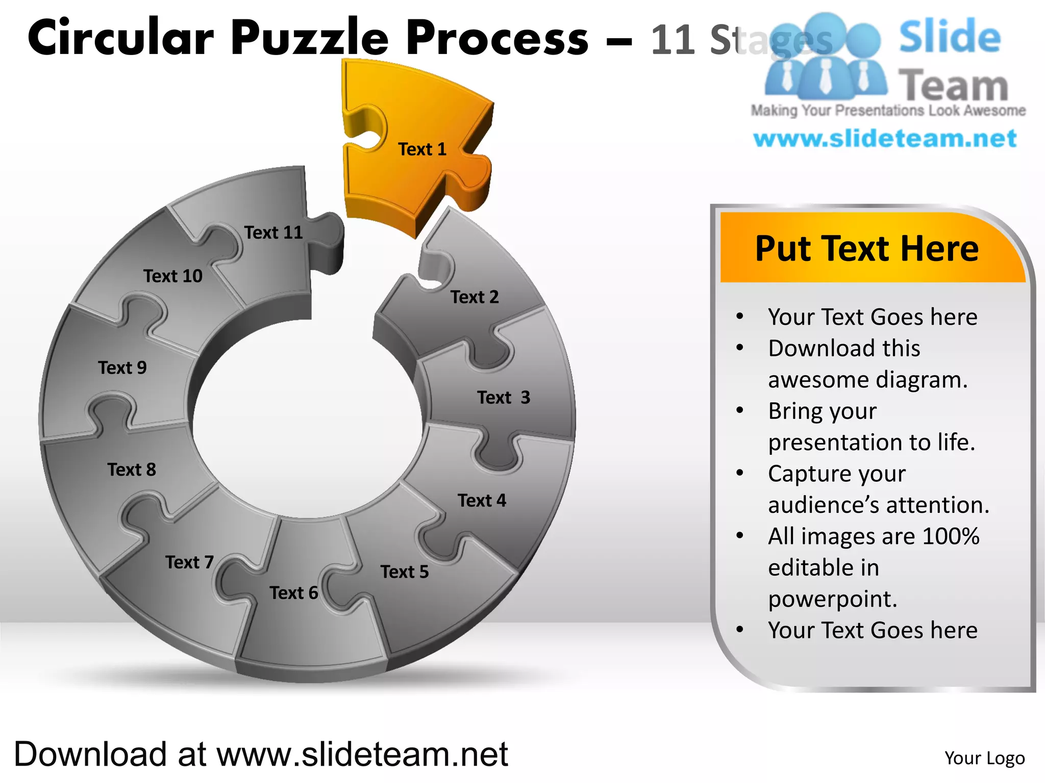 The document describes an 11-stage circular puzzle process. It consists of 11 text boxes arranged in a circular pattern, with an instruction to "put text here" in each box. The summary text can be downloaded from the provided website to customize for a presentation.