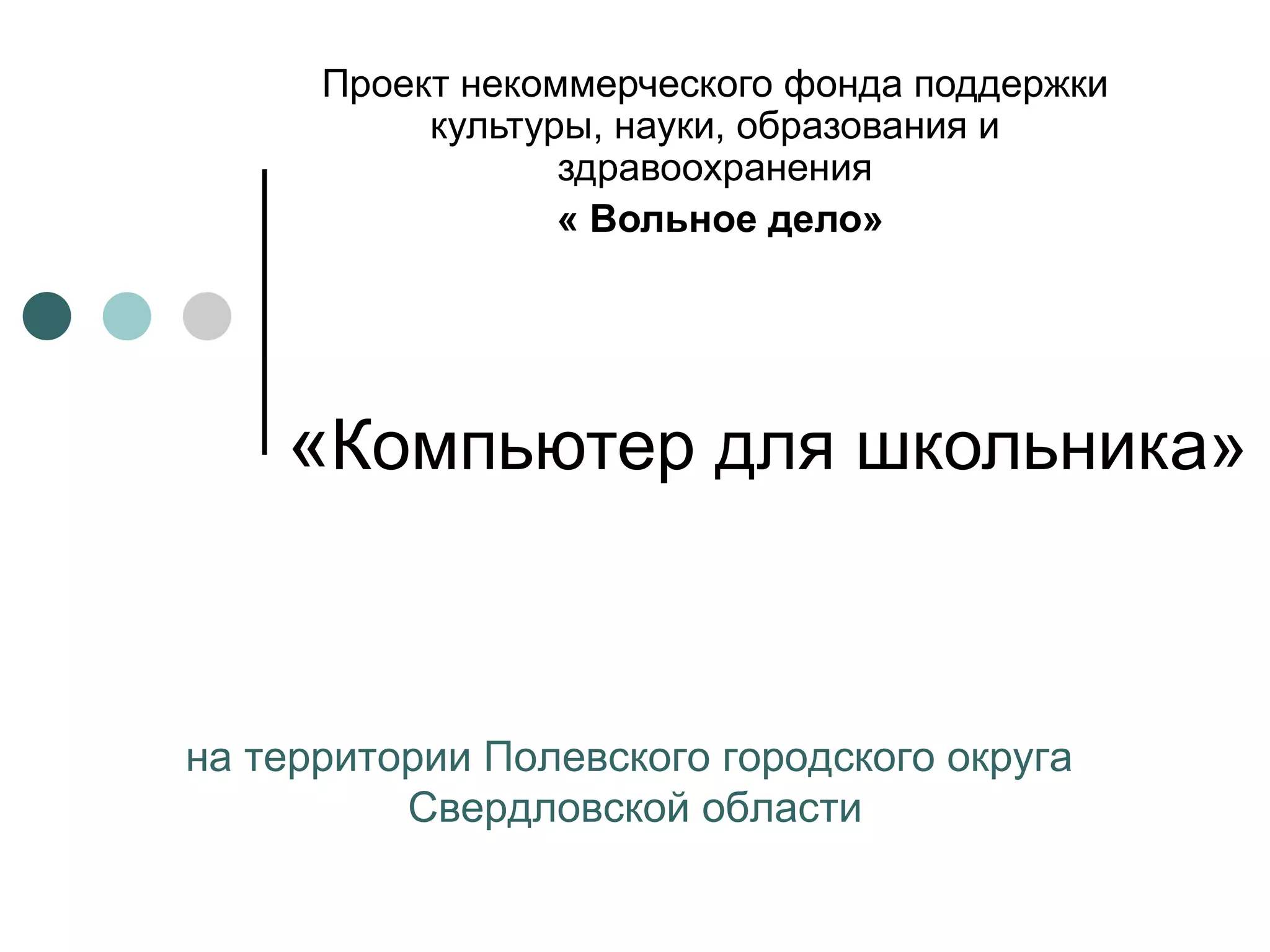 Проект «компьютер для школьника», инициированный некоммерческим фондом «вольное дело», значительно улучшил оснащенность начальных школ Полевского городского округа, предоставив 114 ноутбуков для педагогов и 2790 для учащихся с 1 по 4 класс. Проект, стоимость которого превышает 20 миллионов рублей, включает обучение учителей использованию техники в учебном процессе и планирует расширение на средние школы. Реализация проекта позволила сократить число учащихся на один компьютер с 12 до 2,7 и улучшить качество образования с использованием ИКТ.