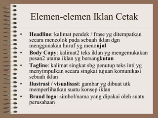 Dokumen ini menjelaskan elemen-elemen penting dalam iklan cetak, termasuk headline, body copy, tagline, ilustrasi, dan brand logo. Masing-masing elemen memiliki fungsi spesifik, seperti menarik perhatian, menyampaikan pesan utama, dan menciptakan identitas merek. Poin-poin strategis diuraikan untuk mengoptimalkan efektivitas iklan.