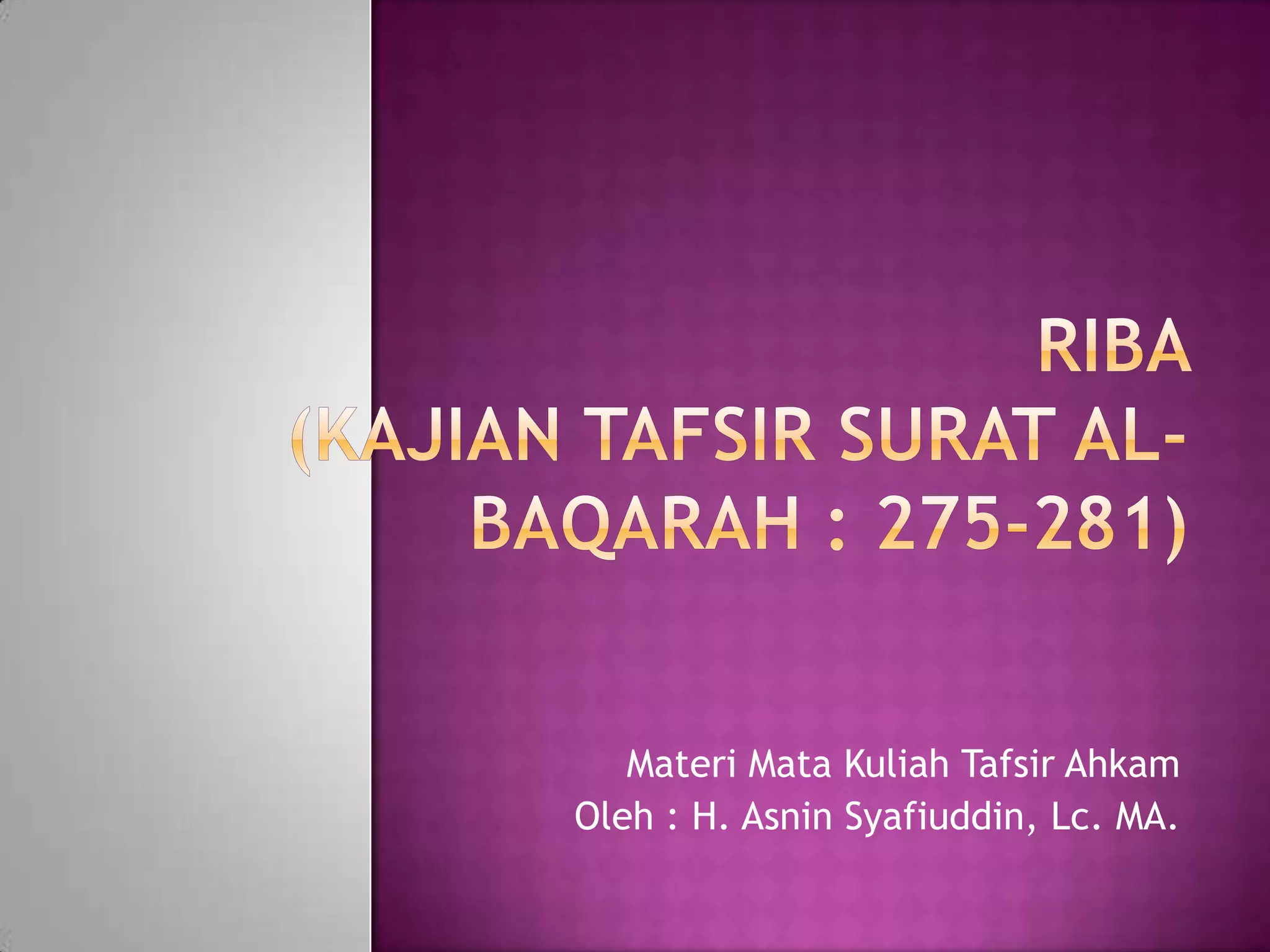 Dokumen ini membahas tentang larangan riba dalam ajaran Islam, menjelaskan konsekuensi bagi pelaku riba dan pentingnya sistem keuangan yang adil. Allah menghalalkan jual beli dan mengharamkan riba, serta menyatakan bahwa riba akan dimusnahkan sementara sedekah akan disuburkan. Mereka yang beriman dan menjalankan amal shalih akan memperoleh pahala, sementara pelaku riba menghadap azab di akhirat.
