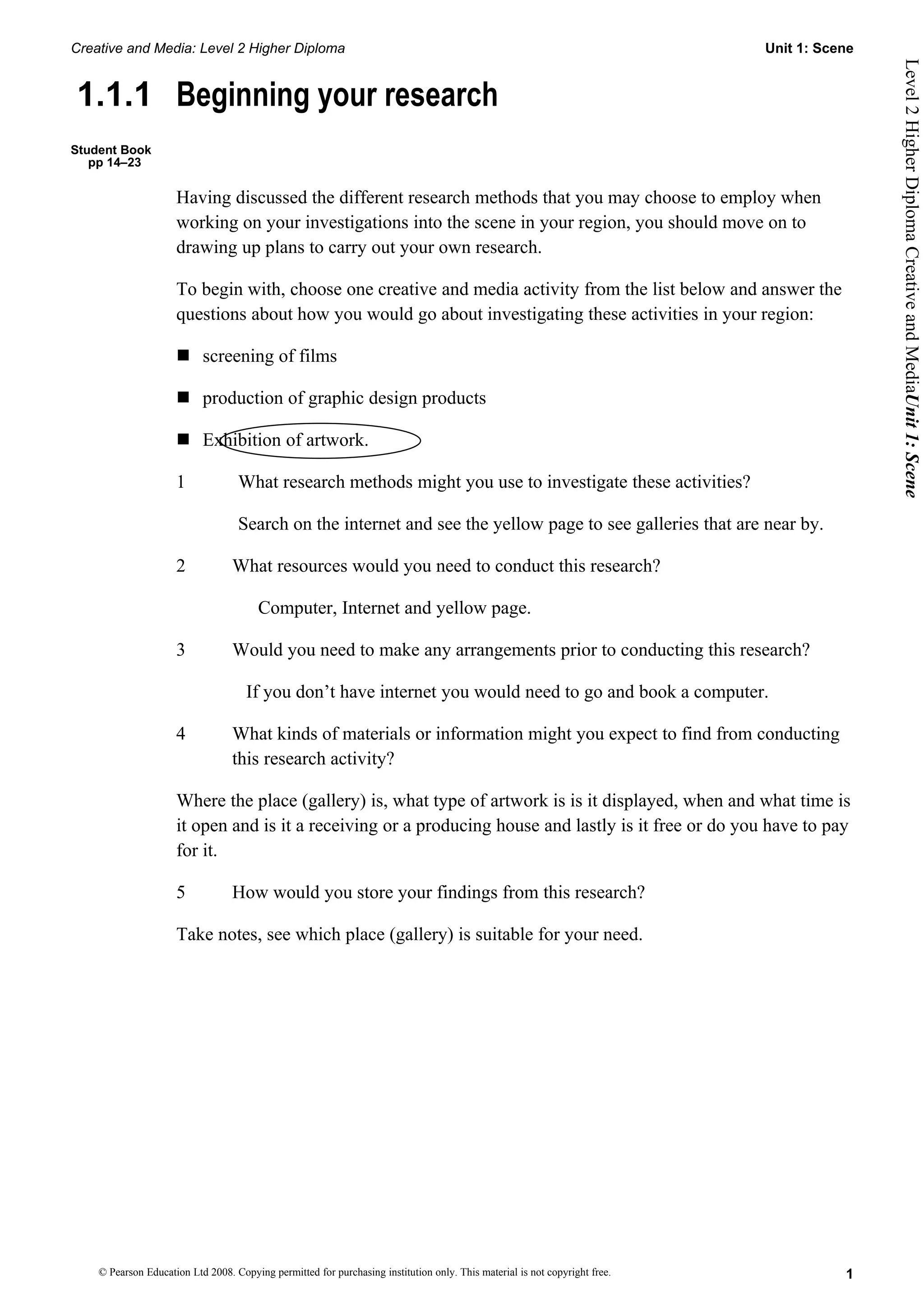 This document provides guidance to students on researching creative and media activities in their local region. It lists screening films, producing graphic designs, and exhibiting artwork as example activities and poses questions for students to consider how they would investigate one of these options. Some of the questions address what research methods and resources would be needed, if arrangements need to be made, what kinds of information may be found, and how findings would be stored. The purpose is to help students plan their own research on the local creative scene.