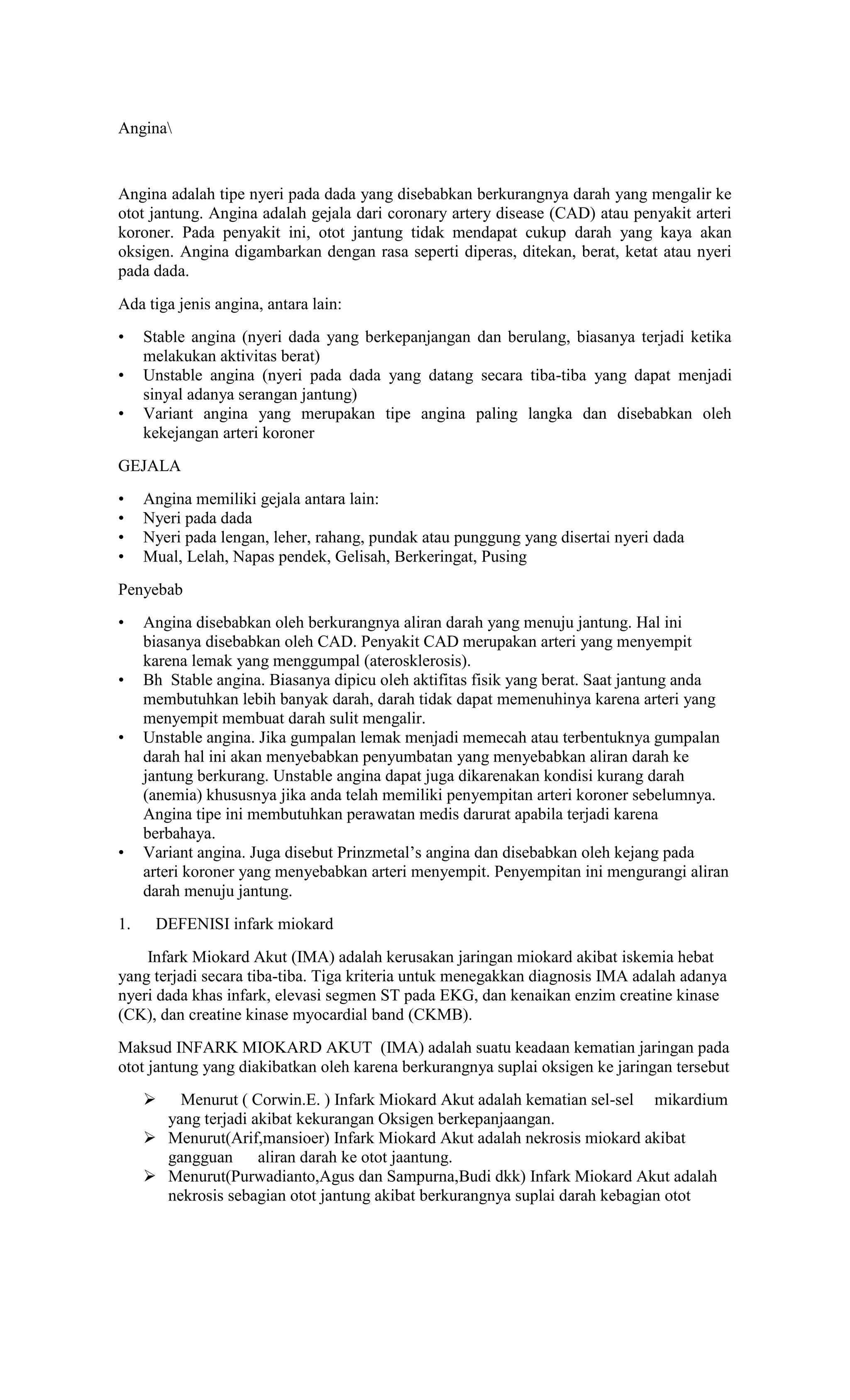 1. Angina adalah nyeri dada yang disebabkan oleh berkurangnya aliran darah ke otot jantung akibat penyempitan arteri jantung.