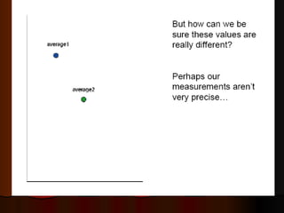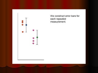 Statistics is the science of collecting and analyzing quantitative data. There are two main types of data: qualitative data which describes characteristics, and quantitative data which is measured numerically. Quantitative data is often displayed graphically, with error bars indicating the precision of the measurements based on the accuracy of the tools used. The standard deviation is a statistic that measures how tightly the data points are clustered around the mean, with a smaller standard deviation indicating more precise results.