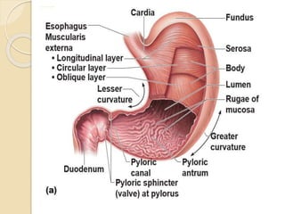 The document discusses the anatomy, blood supply, histology, and physiology of the stomach and duodenum, describing their locations, structures like the gastric glands and layers, innervation by the sympathetic and parasympathetic nervous systems, and secretions including hydrochloric acid and intrinsic factor. Key aspects covered include the divisions of the stomach, its blood supply from the celiac trunk, and how gastric acid secretion is stimulated by foods in the stomach and inhibited by foods entering the duodenum.