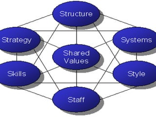 Strategy implementation involves transforming strategic plans into action through detailed planning, communication, organizing resources, and controlling the process. It requires putting tactics and action steps into practice to achieve strategic goals. Effective implementation requires commitment from managers and staff, coherent work plans, performance metrics, resources allocation, and adaptation to changes. The McKinsey 7S framework emphasizes that for implementation to succeed, strategy must be aligned with organizational structure, systems, skills, style, staff, and shared values.