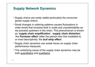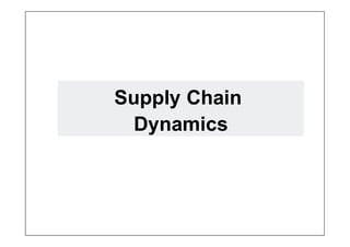 This document discusses supply chain dynamics and the bullwhip effect. It explains that small changes in customer demand can cause larger fluctuations in orders as they move up the supply chain. This disrupts supply chain performance. The causes of unstable supply chains include demand forecasting, order batching, price fluctuations, and lack of coordination. Managing these dynamics requires supply chain coordination through information sharing and alignment, as well as strategies like strategic buffering of inventory and improving operational performance.