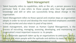 Talent management encompasses the processes of recruiting, developing, and retaining employees to meet organizational needs, particularly in a complex and dynamic business environment. In the context of millennials, who are characterized by their technological savvy and desire for work-life balance, organizations must adopt specific strategies to effectively manage and motivate this generation. The document outlines the importance of talent management in navigating volatility, uncertainty, complexity, and ambiguity (VUCA) while emphasizing the need for adaptability and innovation.