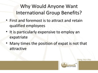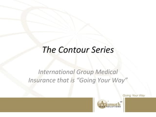 This document describes the Contour Group Medical Insurance Plan, an international group health insurance product. It is provided by Lloyd's of London through their managing general underwriter Azimuth Risk Solutions. The plan offers comprehensive health benefits for groups of 3 or more employees located both inside and outside the US. Agents are encouraged to sell the plan due to the large market potential, high quality of coverage, and stability of the insurer. The claims process involves networks of providers in the US and precertification of services outside the US to arrange direct settlement when possible.