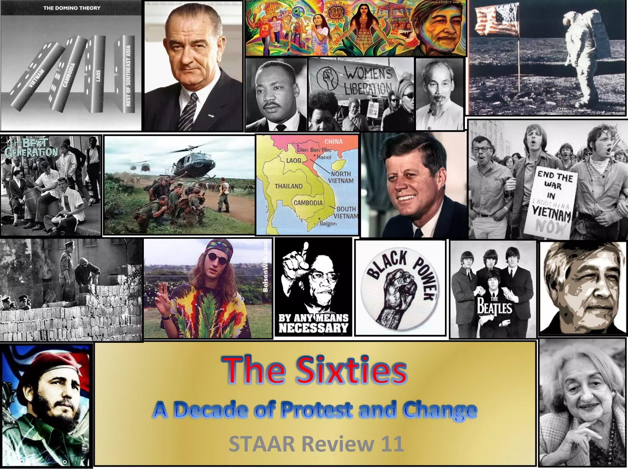 The document provides information on key events during the Kennedy and Johnson presidencies from 1960-1969. It discusses JFK's New Frontier domestic agenda and role in escalating the Space Race. It also summarizes JFK's foreign policy challenges, including the failed Bay of Pigs invasion and Cuban Missile Crisis. The document outlines LBJ's Great Society programs and escalation of US involvement in the Vietnam War. It notes the social movements of this era, including the women's liberation movement and civil rights struggles.