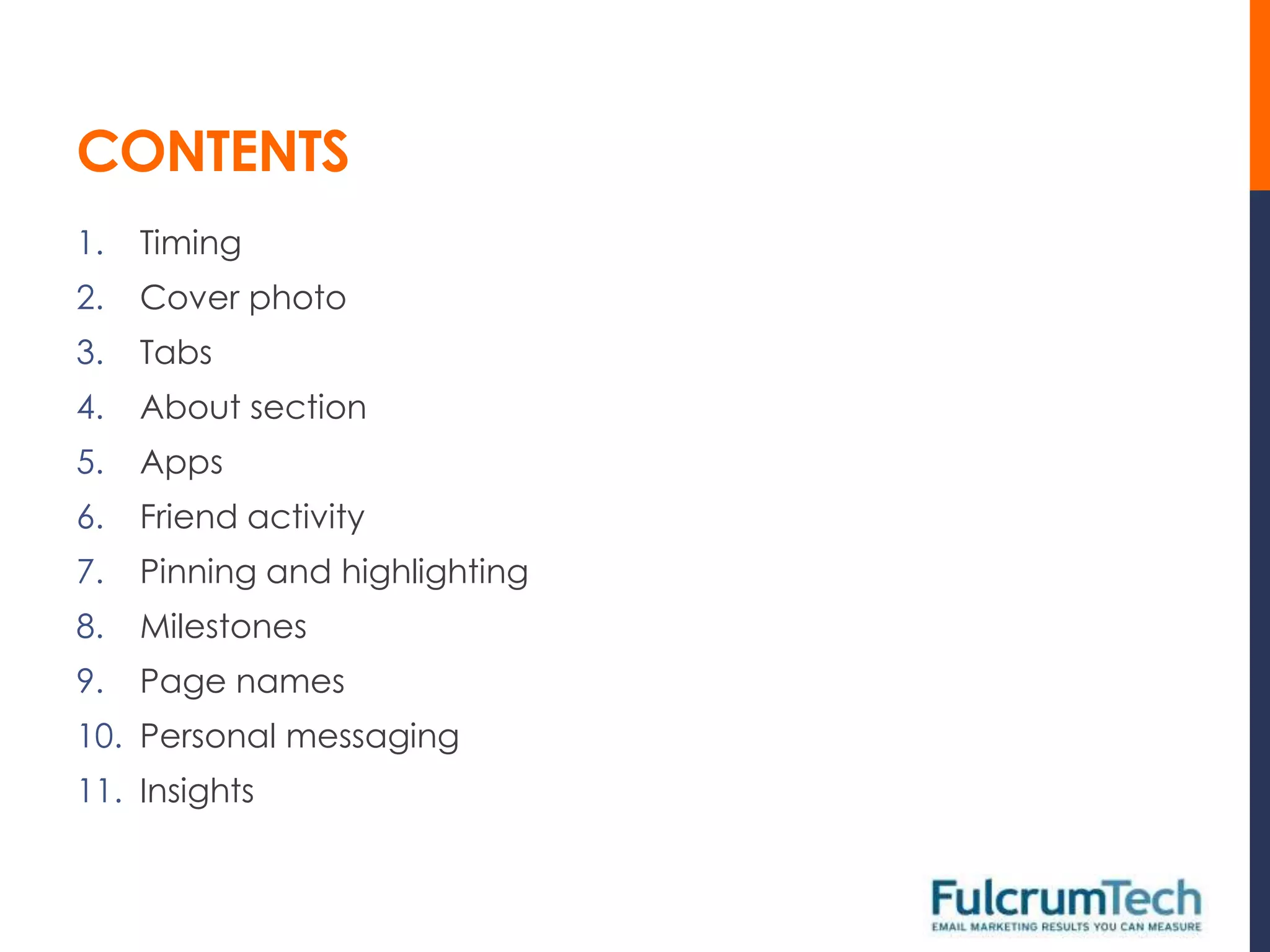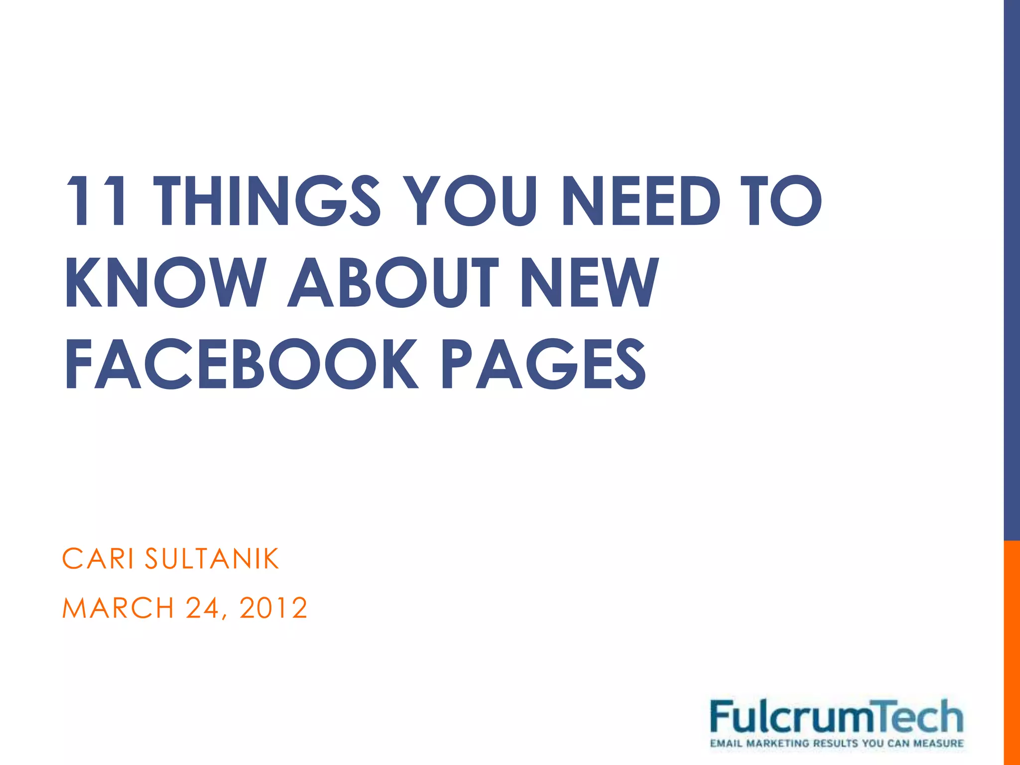 Facebook is upgrading all Pages to a new timeline-based format on March 30, 2012. The key changes include adding a cover photo, reorganizing tabs and the About section, highlighting friend activity and pinned posts, and providing more analytics through Insights. Page owners should choose a cover photo, update their About text, feature important apps and posts, and monitor Insights to improve their Page's performance on Facebook.