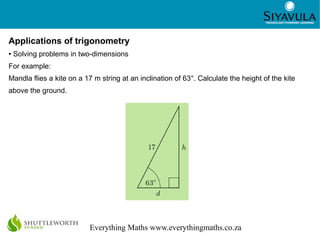 This document discusses applications of trigonometry, including solving problems in two dimensions like calculating the height of a kite on a string at an angle. It also covers finding the height of buildings and calculating angles of elevation and depression. More practice problems can be found on the listed website.