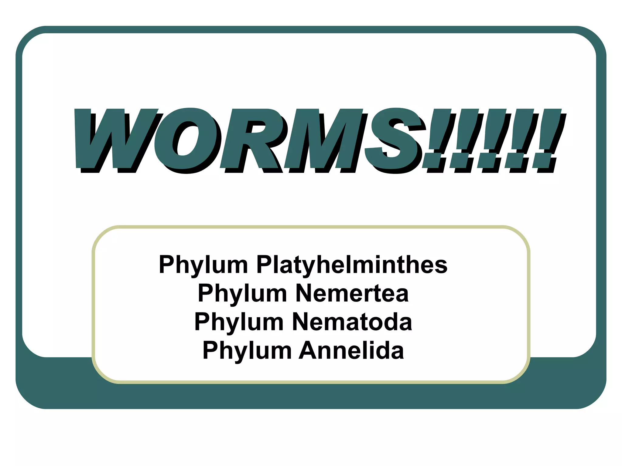 The document discusses four phyla of worms: Platyhelminthes, Nemertea, Nematoda, and Annelida.