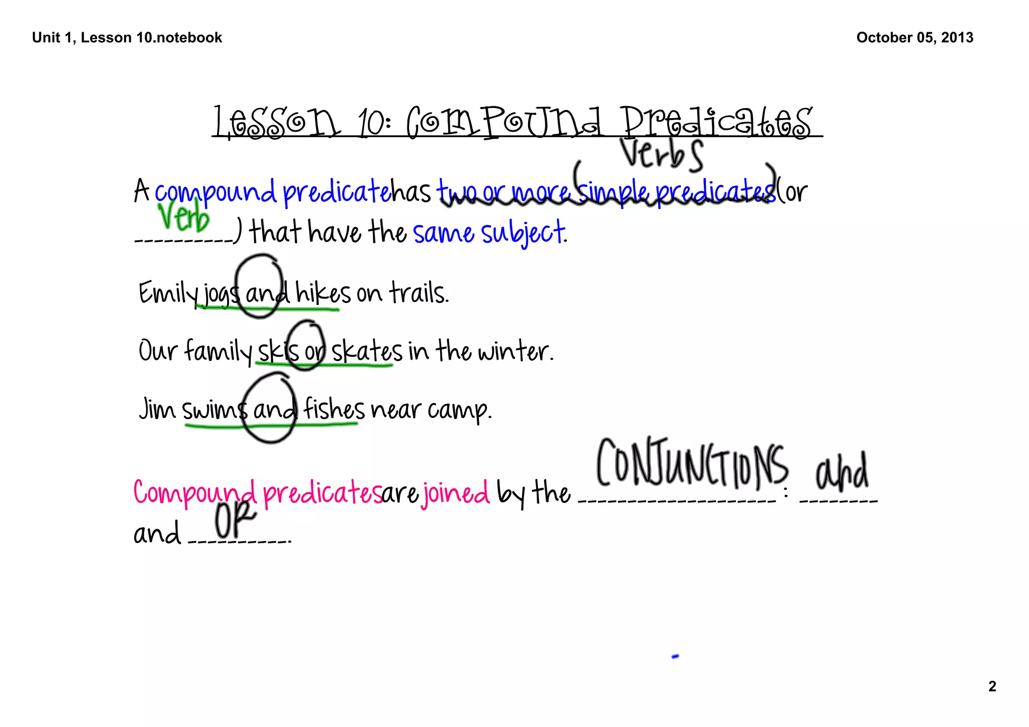 The document discusses a lesson on compound predicates. A compound predicate contains two or more simple predicates that share the same subject. Examples are provided such as "Emily jogs and hikes on trails" and "Our family skis or skates in the winter." Compound predicates are joined by the conjunctions "and" and "or." The document also provides 7 example sentences demonstrating the use of compound predicates.