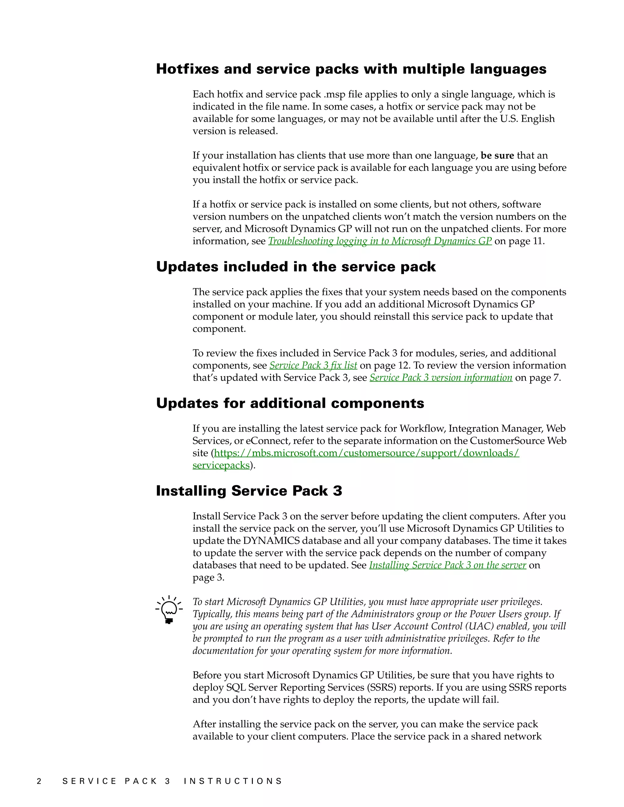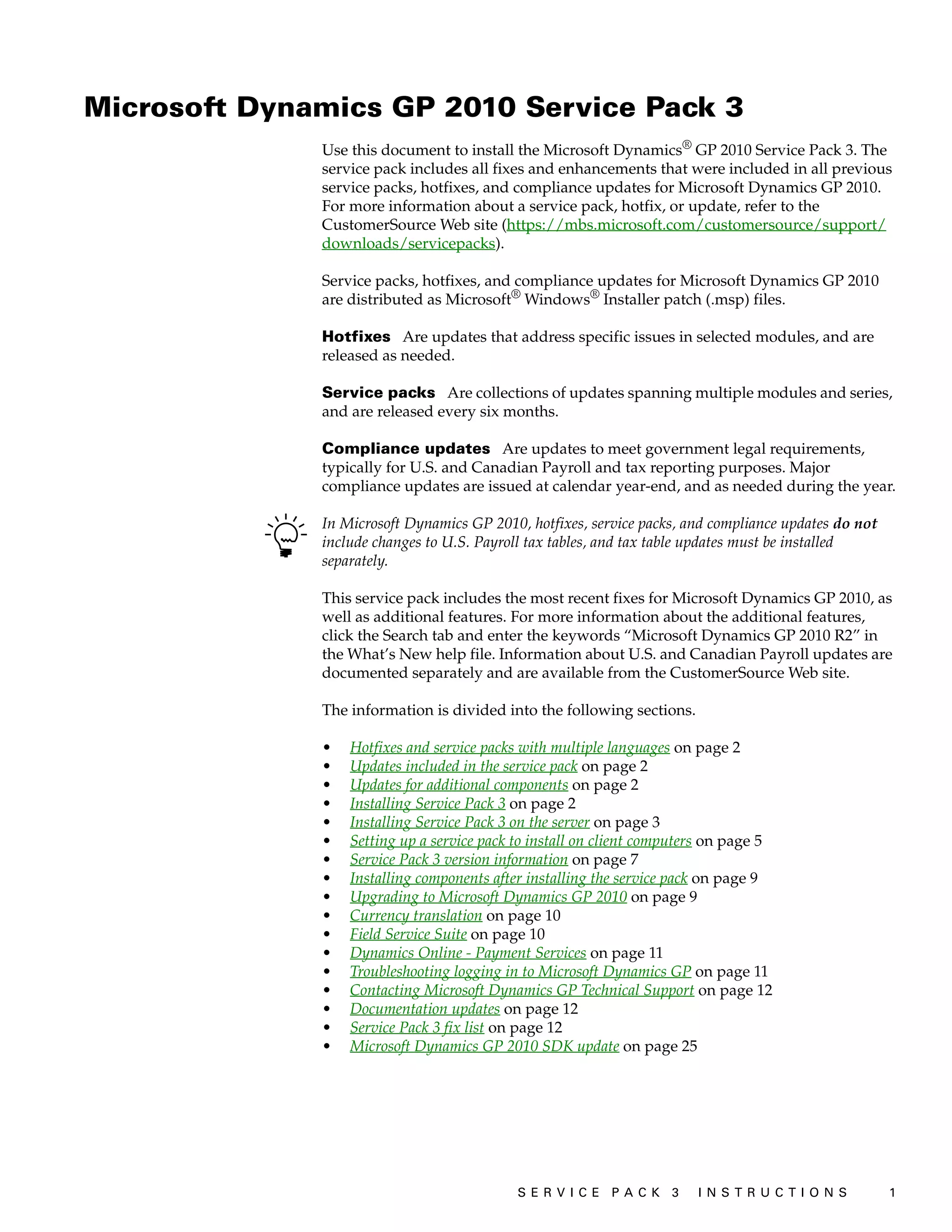 This document provides instructions for installing Microsoft Dynamics GP 2010 Service Pack 3, which includes fixes and enhancements from previous service packs, hotfixes, and updates. The summary includes installing the service pack on the server first by using Microsoft Dynamics GP Utilities to update databases, then setting up the service pack for automatic installation on client computers via a shared network folder. Troubleshooting tips are provided for issues installing on clients.
