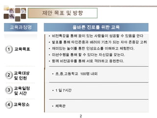• 발표를 통해 타인존중과 배려의 기초가 되는 자아 존중감 고취