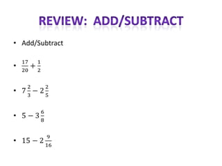 This document provides steps for solving addition and subtraction problems involving fractions and mixed numbers. It outlines 6 steps for adding fractions that include finding the lowest common denominator, adding the fractions, turning the fraction sum into a mixed number, and adding to the whole numbers. It also outlines 4 steps for subtracting fractions that involve setting up the problem, subtracting the fractions, and subtracting the whole numbers which may require borrowing.