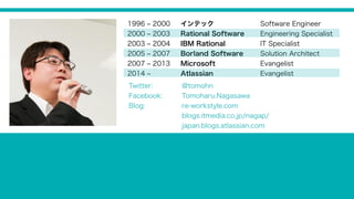 インテック Software Engineer 2000 ‒ 2003 Rational Software Engineering Specialist 2003 ‒ 2004 IBM Rational IT Specialist 2005 ‒ 2007 Borland Software Solution Architect 2007 ‒ 2013 Microsoft Evangelist 2014 ‒ Atlassian Evangelist Twitter: @tomohn Facebook: Tomoharu.Nagasawa Blog: re-workstyle.com blogs.itmedia.co.jp/nagap/ japan.blogs.atlassian.com