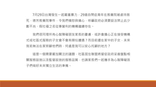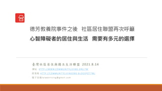 德芳教養院事件引發對心智障礙者居住權利的關注,社區居住聯盟呼籲提供多元選擇以保障他們的生活品質。目前台灣大部分心智障礙成年人仍住在家中或機構中,社區居住方案逐漸獲得認可,但仍需推廣以増加受益人數。聯盟強調服務質量和管理的重要性,倡導政府加大對社區居住方案的支持。
