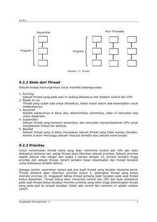 Bab 9 membahas tentang konsep thread dalam pemrograman. Thread merupakan pengontrol aliran program yang memungkinkan beberapa proses dieksekusi secara bersamaan dalam satu program. Terdapat dua cara untuk menciptakan thread yaitu dengan menurunkan class Thread atau mengimplementasikan interface Runnable. Thread dapat berinteraksi antara satu dengan yang lainnya menggunakan metode join dan sinkronisasi untuk mengkoordinasikan sumber daya dan aktivitas.