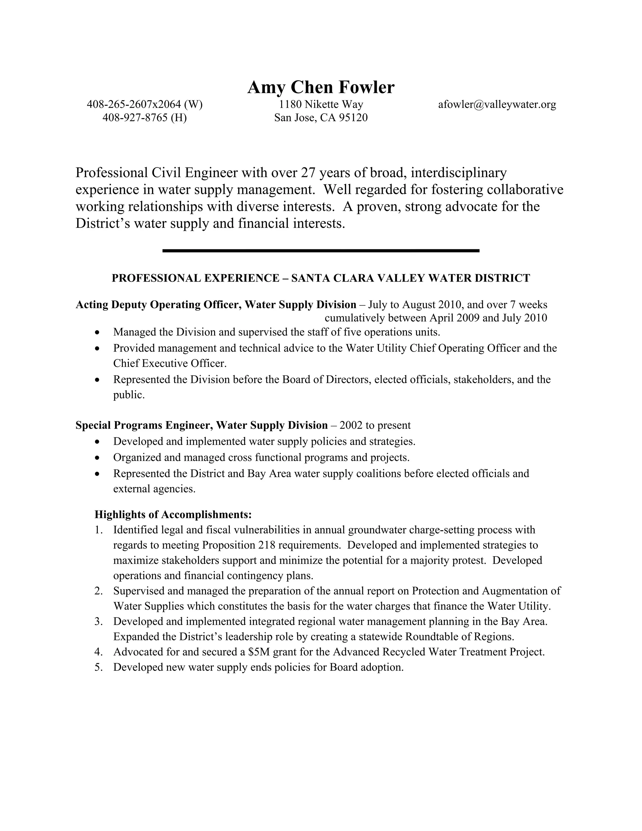 Amy Chen Fowler is a professional civil engineer with over 27 years of experience in water supply management. She has held several leadership roles within the Santa Clara Valley Water District, including Acting Deputy Operating Officer and Special Programs Engineer. She has a proven track record of developing and implementing policies, projects, and strategies to protect the District's water supply and financial interests.