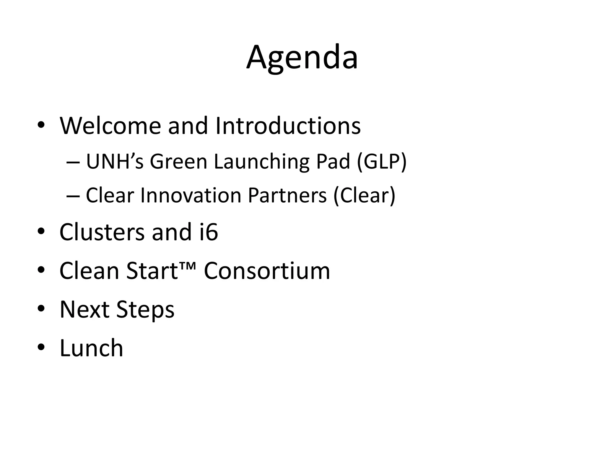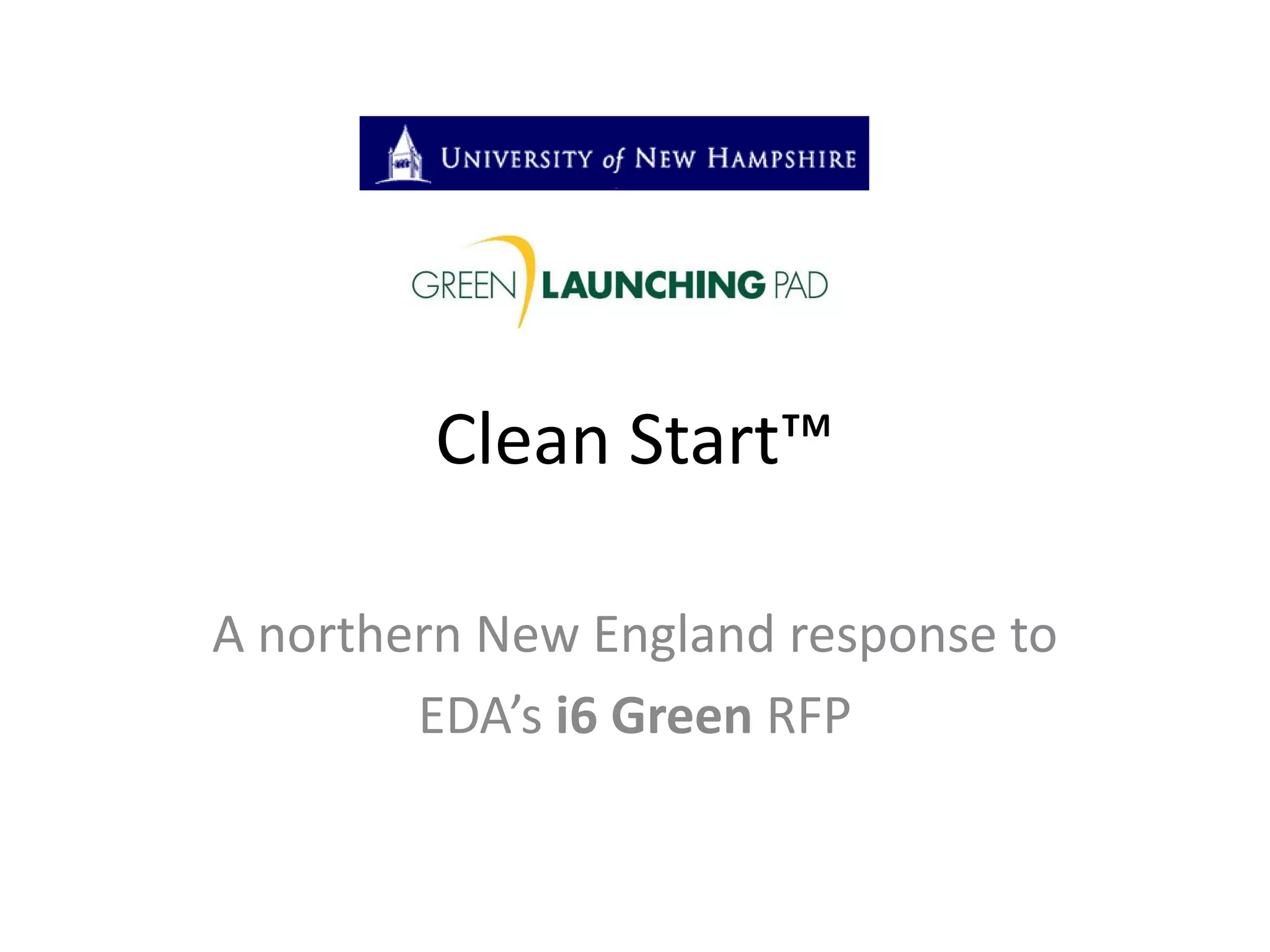 This document outlines a proposal by the University of New Hampshire (UNH) and partners to create a Clean Start consortium to win $1 million in funding from the US Economic Development Administration's (EDA) i6 Green competition. The consortium would establish multiple Proof of Concept Centers (PCCs) across Northern New England focused on green energy innovation and entrepreneurship. It would fill gaps at existing PCCs through competitive seed grants, mentorship, education programs, and technical assistance. If selected, the organizers would help deliver the program and facilitate collaboration among PCC members and partners across Maine, New Hampshire, and Vermont.
