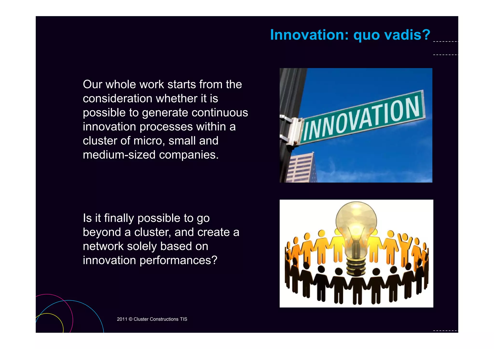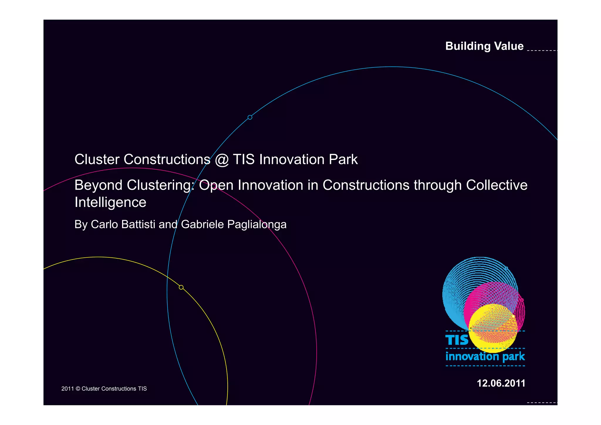 The document discusses the concept of open innovation within a cluster of micro, small, and medium-sized companies in the construction industry, specifically in South Tyrol, Italy. It emphasizes the importance of collective intelligence and knowledge sharing as a means to drive continuous innovation and competitiveness among local firms. The cluster's mission involves enhancing innovation processes by integrating various theoretical models and leveraging insider knowledge to increase the effectiveness and success rate of innovation initiatives.