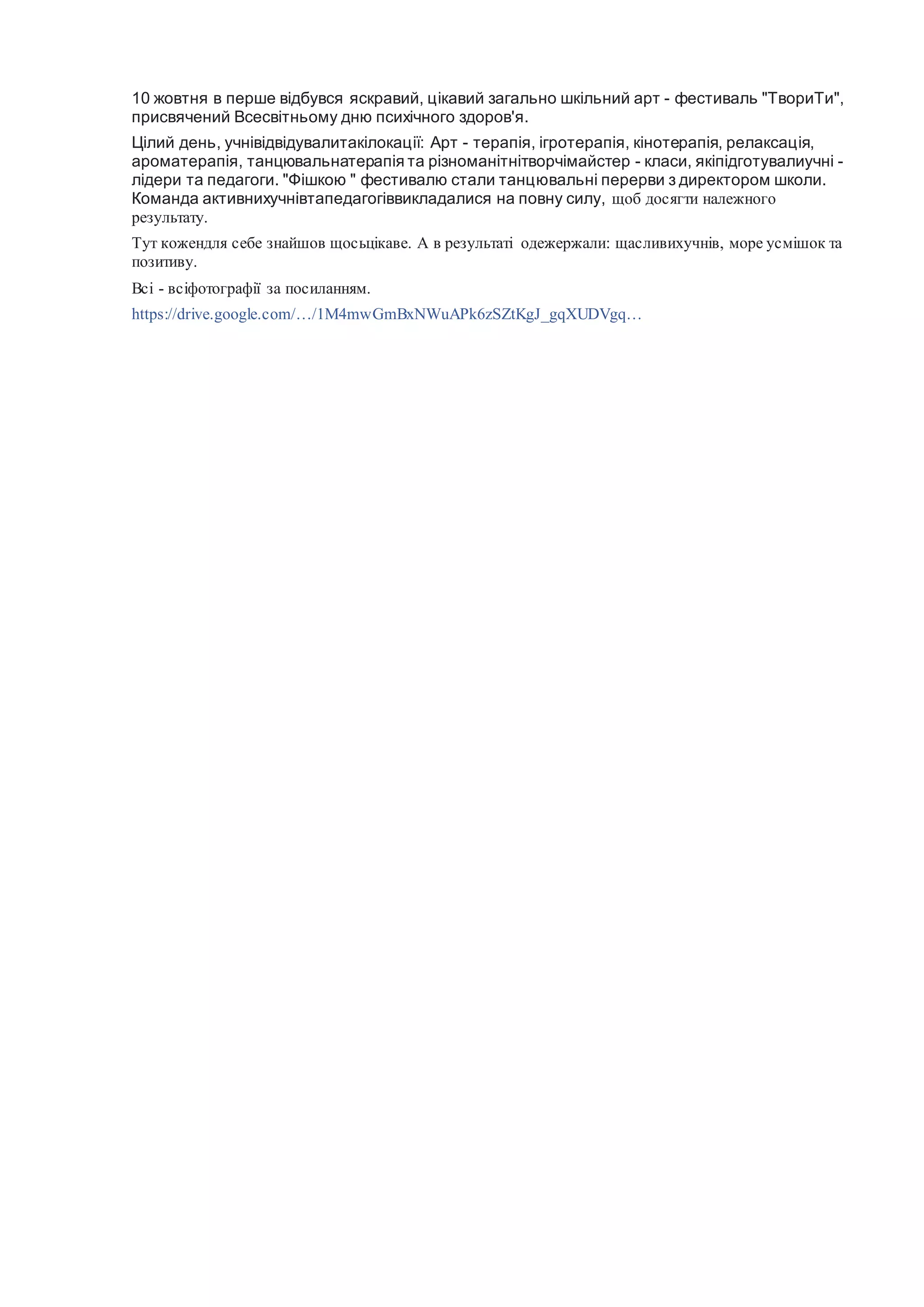 10 жовтня вперше відбувся яскравий, цікавий загально шкільний арт - фестиваль "ТвориТи",