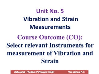 This document discusses various methods of vibration and strain measurement. It describes different types of instruments used to measure vibration, including velocity pickups, accelerometers, and inductive transducers. It also discusses strain gauges and strain measurement, covering topics like the requirements of ideal strain gauges, terms related to strain gauges, classification of strain gauges, strain gauge materials, and types of strain gauges like metal foil gauges and semi-conductor gauges.