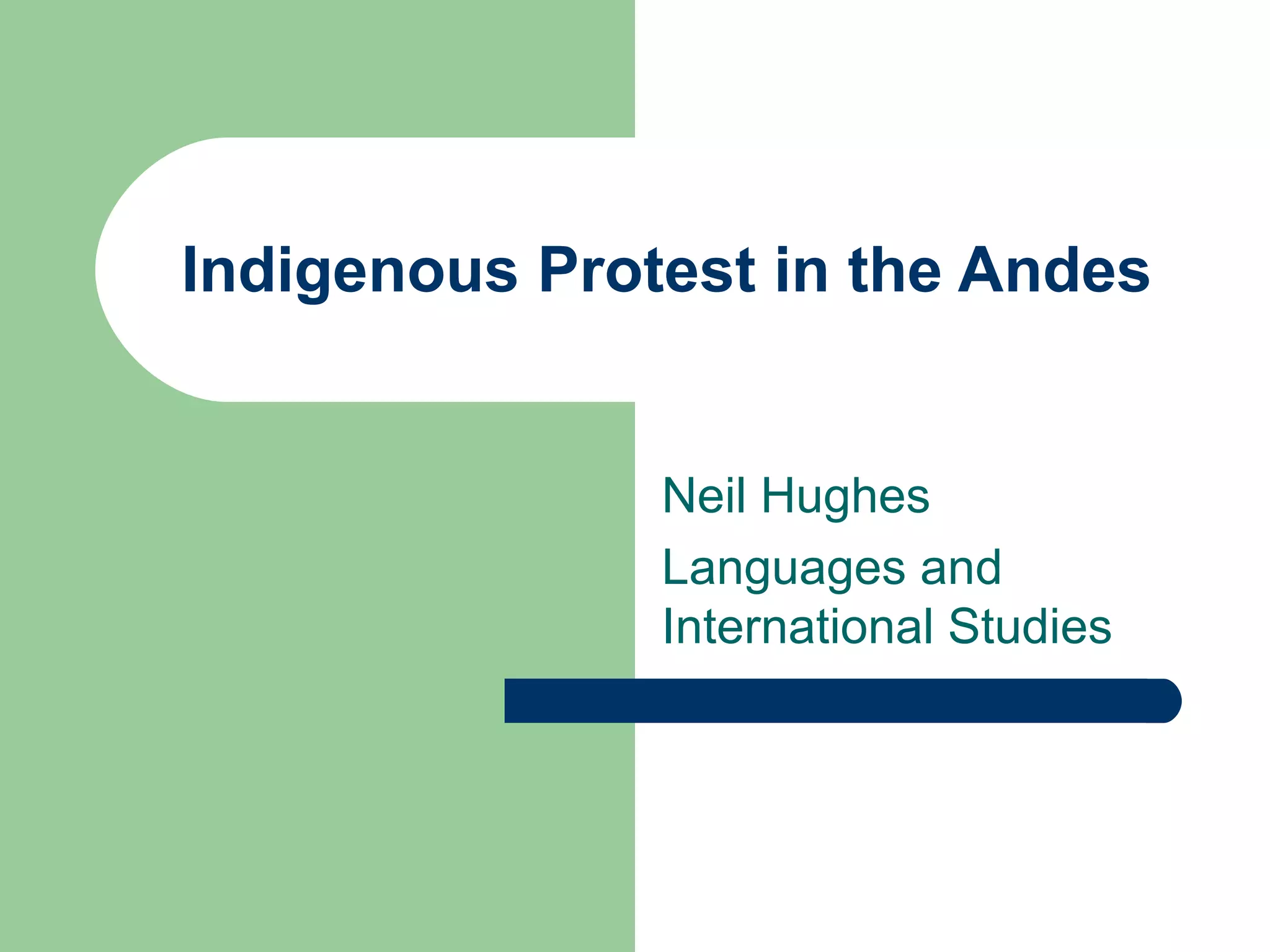 This document discusses indigenous protest in the Andes region in response to neoliberal policies and privatization of natural resources. It describes the social composition of indigenous and peasant organizations leading protests in countries like Ecuador, Bolivia, and Peru. The causes of protest included free trade agreements negatively impacting livelihoods and lack of consent for resource extraction. Protest actions ranged from road blockades to electoral participation. Impacts included blocking neoliberal reforms, constitutional recognition of indigenous rights, and increased political representation.