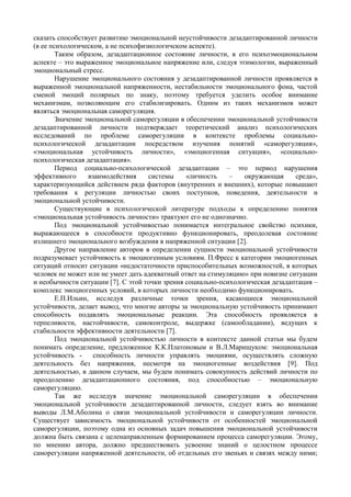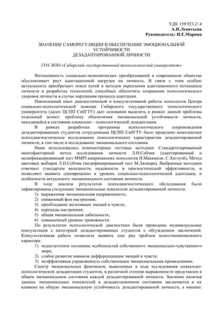 Документ рассматривает значение эмоциональной саморегуляции для обеспечения устойчивости дезадаптированной личности в условиях социально-психологической дезадаптации. Психодиагностическое исследование выявляет основные эмоциональные проблемы дезадаптированных студентов, включая эмоциональную напряженность и тревожность, и подчеркивает важность развития навыков саморегуляции для поддержания психоэмоционального состояния. Авторы проводят анализ теоретических подходов к саморегуляции и ее роли в стабилизации эмоционального фона личности.