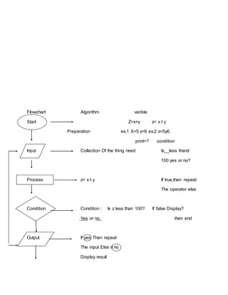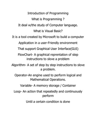 This document introduces basic concepts of programming and visual basic. It defines programming as the study of computer languages. It describes Visual Basic as a tool created by Microsoft to build graphical user interface applications in an easy-to-use environment. The document also defines key programming concepts like flowcharts, algorithms, operators, variables, and loops. It provides examples of how these concepts are used, such as in a sample flowchart that includes starting and ending points, conditions, and repeating or ending program execution based on conditions.