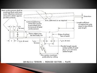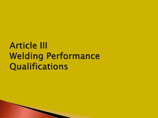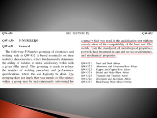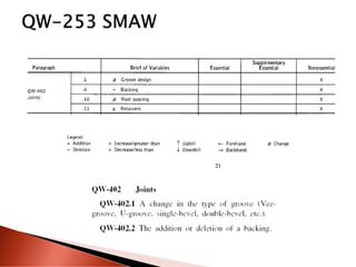 The document provides an overview of ASME Section IX, focusing on the compliance of welding procedures and qualifications with the applicable Boiler and Pressure Vessel Code. It details the requirements for weld procedure specifications (WPS) and procedure qualification records (PQR), covering mechanical testing standards, essential and nonessential variables, and the qualification process for welders and welding operators. The text emphasizes the importance of proper documentation, testing, and the implications of any changes to the approved welding processes.