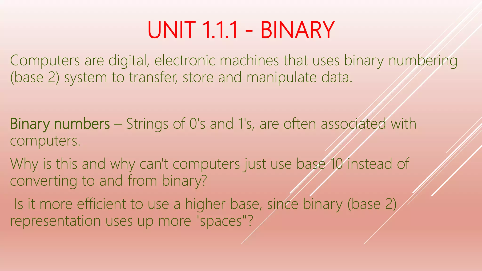 The document explains the fundamentals of binary computers, which operate using a binary numbering system (base 2) to transfer, store, and manipulate data through digital encoding of bits (0s and 1s). It covers the efficiency of binary logic, the advantages of bistable devices, and contrasts binary with decimal and hexadecimal systems, emphasizing the significance of various number bases in digital computing and data representation. Additionally, it discusses memory size measurements, differentiates between kilobytes and kibibytes, and provides examples of conversion between binary and decimal forms.