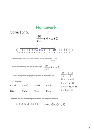 The document provides steps to solve an inequality involving fractions: (1) determine values of x that make the fraction undefined by setting the denominator equal to 0; (2) turn the inequality sign into an equal sign to form an equation; (3) solve the equation and graph points on a number line; (4) test points to determine what values satisfy the inequality; (5) shade the number line to show the interval of values for which the inequality is true.