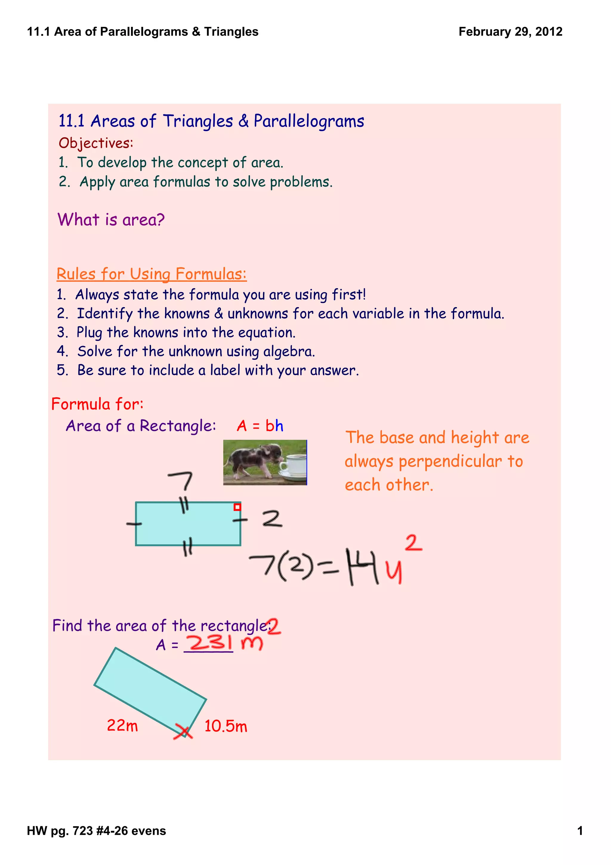 This document provides formulas and examples for calculating the areas of rectangles, parallelograms, and triangles. It explains that the area of a rectangle is length times width, the area of a parallelogram is base times height, and the area of a triangle is one-half base times height. The document includes practice problems that require applying these formulas to find missing values like areas, perimeters, and heights.
