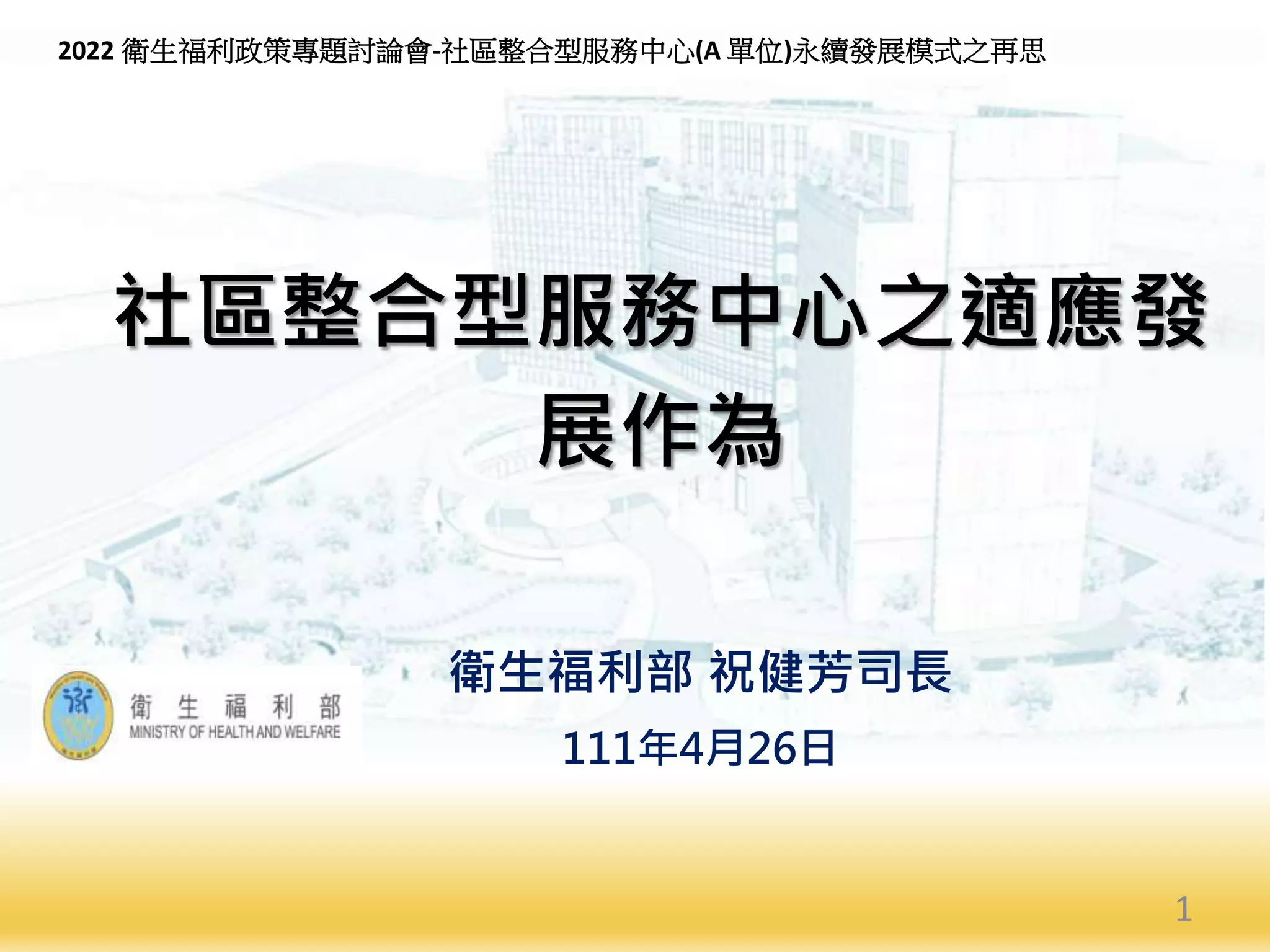 文档探讨了台湾社区整合型服务中心的发展策略与长照政策,包括推动人本照护与社区为基础的照护体系的关键目标及实施措施。长照2.0计划透过多样化的服务提供,旨在提升服务质量与效率,以应对失能老人及其他需求者的照护需求。未来展望则强调了专业能力提升与服务质量监控的重要性,以确保长照服务的可持续性与公平性。
