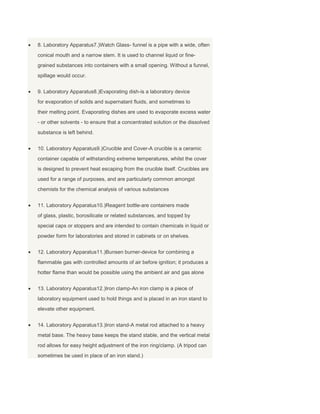 The document describes various pieces of laboratory equipment used in scientific experiments. It provides details on 35 different apparatus including beakers, test tubes, flasks, graduated cylinders, funnels, watch glasses, evaporating dishes, crucibles, reagent bottles, Bunsen burners, clamps, stands, rings, test tube holders, brushes, gauges, tripods, spatulas, stirring rods, mortar and pestles, droppers, racks, thermometers, microscopes, balances, pipettes, burettes, platforms, analytical balances, alcohol lamps, aspirators, tongs, volumetric flasks, and spring balances. Each apparatus has a specific purpose and function within a laboratory setting.