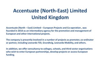Accentuate (North-East) Limited is a VET consultancy organization located in the rural northeast of England near the Scottish border. It will use its experience from previous wind energy projects to lead Work Package 2 in the Leonardo da Vinci 2011-2013 VET-Wind project, focusing on developing wind technician training content and competencies. Key staff involved include Ian Fisher, an experienced wind energy training developer, and Stewart Deas, with expertise in designing Leonardo and EU projects.