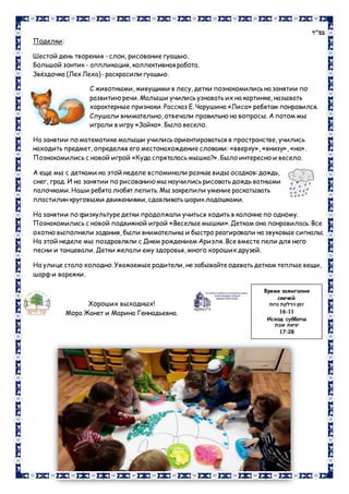 В этом документе обсуждаются занятия неделей, посвящённые теме создания мира и фигуре Авраама. Дети учились различать животных, знакомились с осадками, а также занимались творчеством и физической активностью. Родителям напоминают о необходимости одевать детей тепло в связи с похолоданием.