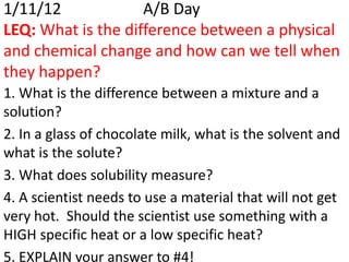 A physical change alters a substance's physical properties but not its chemical identity, while a chemical change transforms a substance into different substances through breaking or forming of chemical bonds. Changes in color, mass, or release of gases indicate a chemical change has occurred, whereas changes in state or phase without a new substance forming signal a physical change. Students can identify if a change is physical or chemical based on observable evidence like changes in properties or formation of new substances.