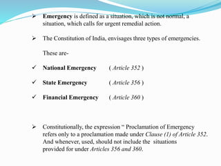The document summarizes the different types of emergencies provided under the Constitution of India - National Emergency, State Emergency, and Financial Emergency. It provides details on the grounds, process, duration, and consequences of declaring each type of emergency. National Emergency can be declared by the President due to war, external aggression, or armed rebellion and allows certain fundamental rights to be suspended. State Emergency can be declared if a state government is unable to function constitutionally. Financial Emergency can be declared if the financial stability of India is threatened.