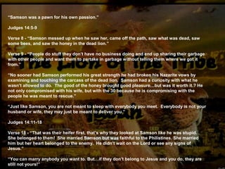 The document discusses the importance of sanctification and the potential dangers of compromising one's purpose with societal influences, illustrated through the biblical story of Samson. It emphasizes the necessity of prioritizing one's relationship with God over worldly distractions and highlights the consequences of engaging with what is spiritually 'dead.' The key message is that true salvation requires total dependence on God, eschewing disobedience and any ties to sinful influences.