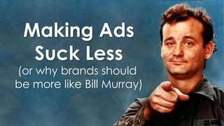 Mike Cole discusses how brands can improve their advertising strategies by embracing creativity and authenticity, drawing inspiration from Bill Murray's unpredictable yet consistent brand. He emphasizes the importance of having a budget for 'awesome' initiatives and reacting to unique circumstances in a way that aligns with a brand's identity. The document concludes with a clarifying statement about the quality and ingredients of McDonald's chicken McNuggets.