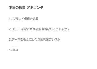ブランド価値の定義 2. もし、あなたが商品担当者ならどうするか? 3. テーマをもとにした企画発案ブレスト 4. 総評