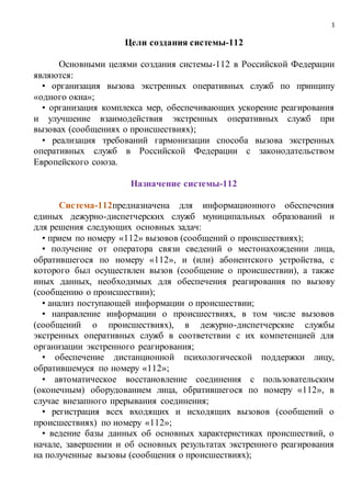 Документ описывает систему-112 в Российской Федерации, предназначенную для организации вызова экстренных служб по принципу «одного окна» и улучшения взаимодействия между ними. Система позволяет быстро принимать вызовы, получать информацию о местонахождении вызова, а также предоставляет психологическую поддержку. Пользоваться номером 112 можно в экстренных ситуациях, таких как пожары, преступления или медицинские неотложные случаи, а также существует возможность отправки SMS-сообщений для глухих и слабослышащих граждан.
