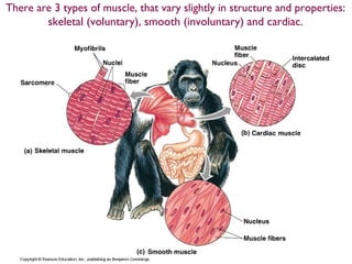There are three main types of muscle tissue - skeletal, smooth, and cardiac. Muscle fibers are multinucleate cells formed from the fusion of individual embryonic muscle cells. Within each fiber are many parallel myofibrils composed of repeating sarcomere units. A sarcomere contains overlapping actin and myosin filaments. When an action potential reaches the neuromuscular junction, acetylcholine is released causing calcium ions to enter the fiber and allow the myosin heads to bind to actin, pulling the filaments together and contracting the muscle fiber. ATP provides energy to break the binding and reset the filaments for the next contraction.