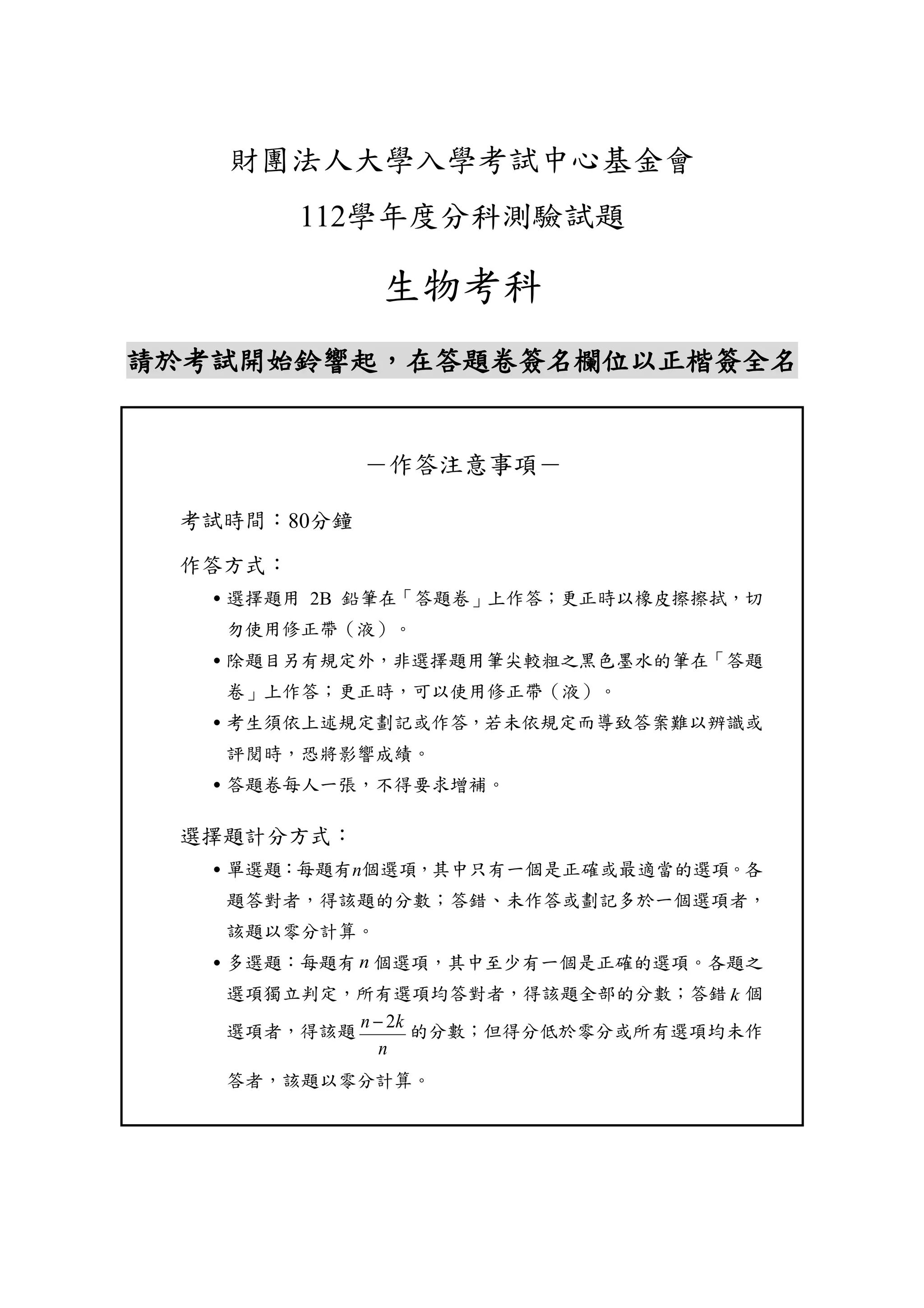 財團法人大學入學考試中心基金會 112學年度分科測驗試題 生物考科 請於考試開始鈴響起,在答題卷簽名欄位以正楷簽全名 -作答注意事項- 考試時間:80分鐘 作答方式: ˙選擇題用 2B 鉛筆在「答題卷」上作答;更正時以橡皮擦擦拭,切 勿使用修正帶(液)。 ˙除題目另有規定外,非選擇題用筆尖較粗之黑色墨水的筆在「答題 卷」上作答;更正時,可以使用修正帶(液)。 ˙考生須依上述規定劃記或作答,若未依規定而導致答案難以辨識或 評閱時,恐將影響成績。 ˙答題卷每人一張,不得要求增補。 選擇題計分方式: ˙單選題:每題有n個選項,其中只有一個是正確或最適當的選項。各 題答對者,得該題的分數;答錯、未作答或劃記多於一個選項者, 該題以零分計算。 ˙多選題:每題有