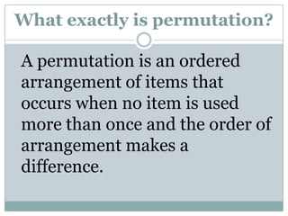 A permutation is an ordered arrangement of items where order matters and no item is used more than once. The number of permutations of n items taken r at a time is calculated as nPr = n!/(n-r)!. Factorial notation, written as n!, represents the product of all positive integers down to 1. For example, 5! = 5 x 4 x 3 x 2 x 1. Permutations with duplicate items use the formula n!/(p!q!r!...) where p,q,r... represent the numbers of identical items.