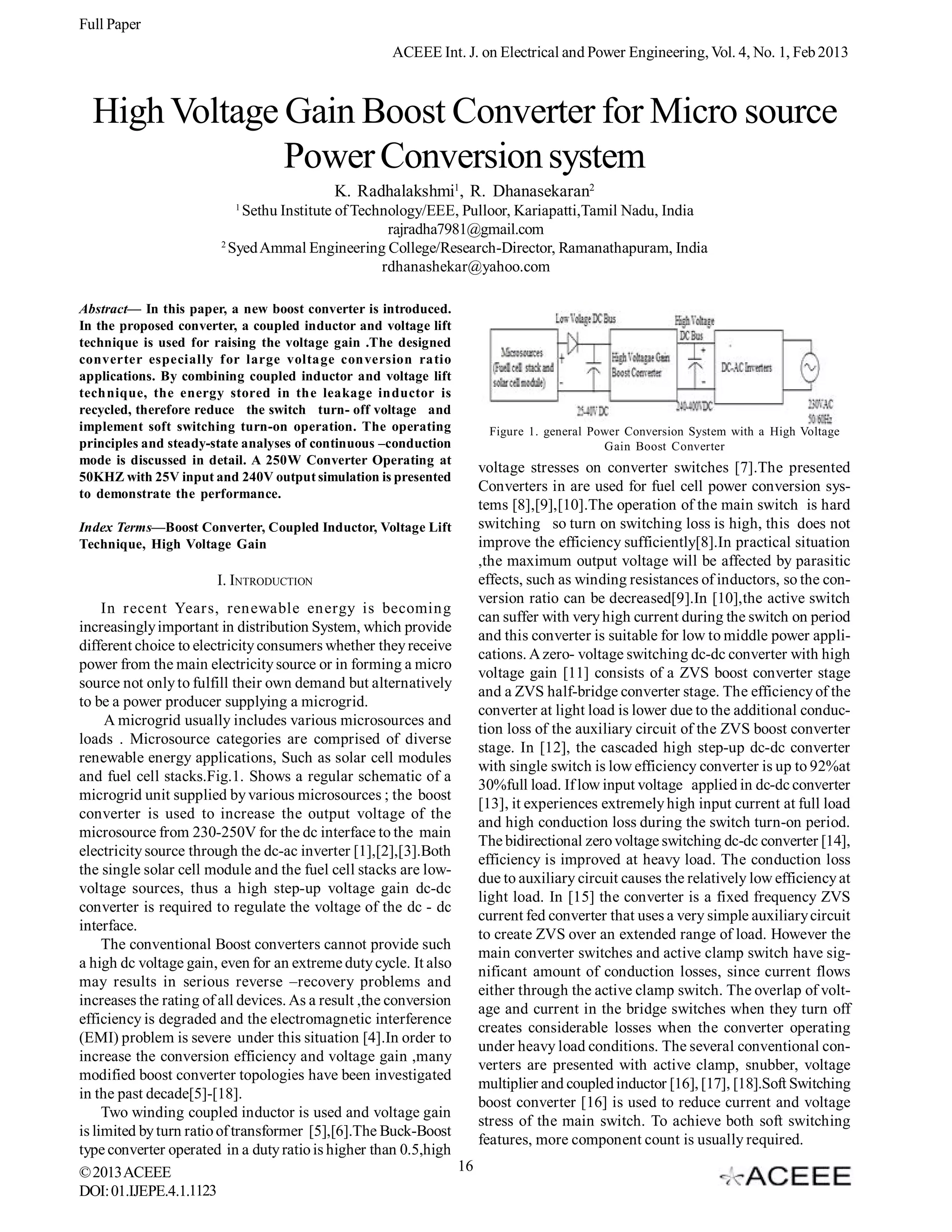 The document presents a new high voltage gain boost converter design that uses a coupled inductor and voltage lift technique. Key features of the proposed converter include: